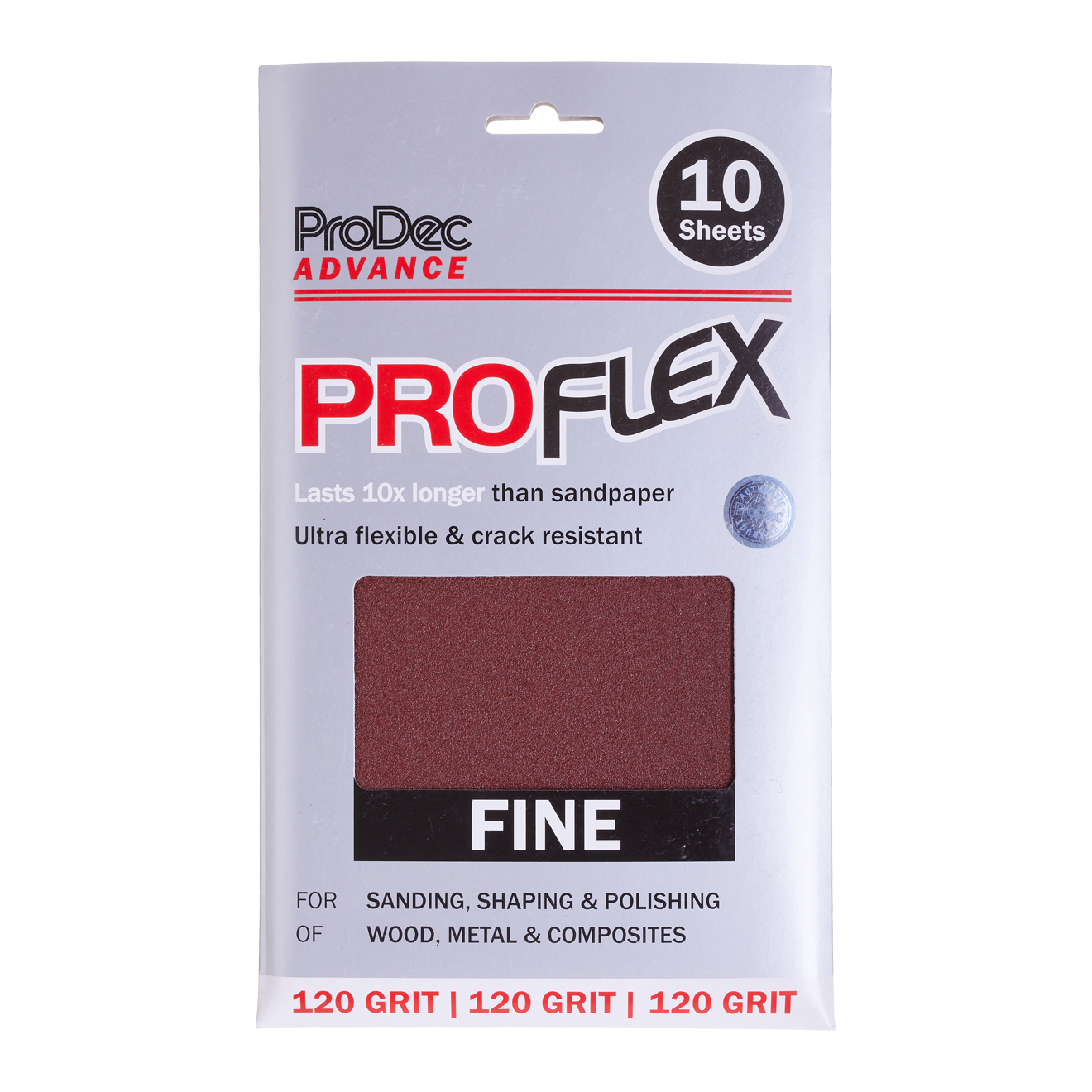 Outlasting sandpaper by up to 10 times, aluminium oxide is the abrasive paper of choice used by trade professionals and ProFlex takes it to the next level. It replaces the standard backing paper with an ultra-flexible, crack-resistant cotton cloth, giving outstanding performance with curved and profiled surfaces by moulding effortlessly to match their shape for fast, efficient sanding. Featuring durable aluminium oxide grains that have a self-sharpening action and clog less, ProFlex is ideal both for hand sanding - with or without a sanding block. These half size sheets are ideal for smaller jobs and are available in Fine, Medium and Coarse grits and an Assorted pack.
