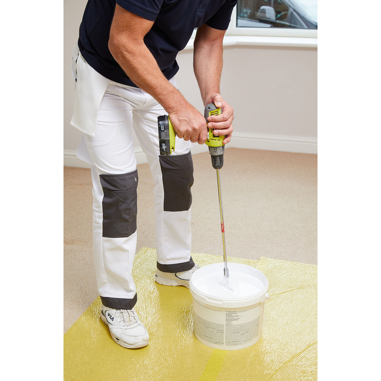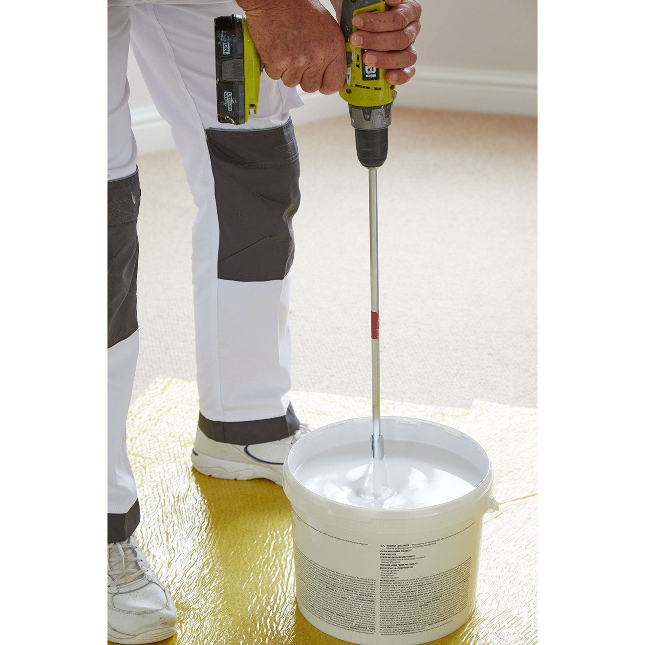 You need your paint to be consistent throughout the tin, and a layer of liquid on the surface has to be stirred in, as does any stray colourant – both of these cause streaks but neither are a problem as long as they’re stirred back in. Hand mixing is the way to go for smaller sizes, but for 10 litre tubs and larger, it’s time consuming and heavy on the arm. A drill stirrer will do in moments what it takes a hand stirrer ages to do, and it will do it more effectively.