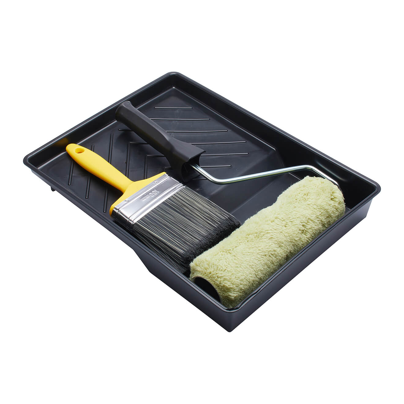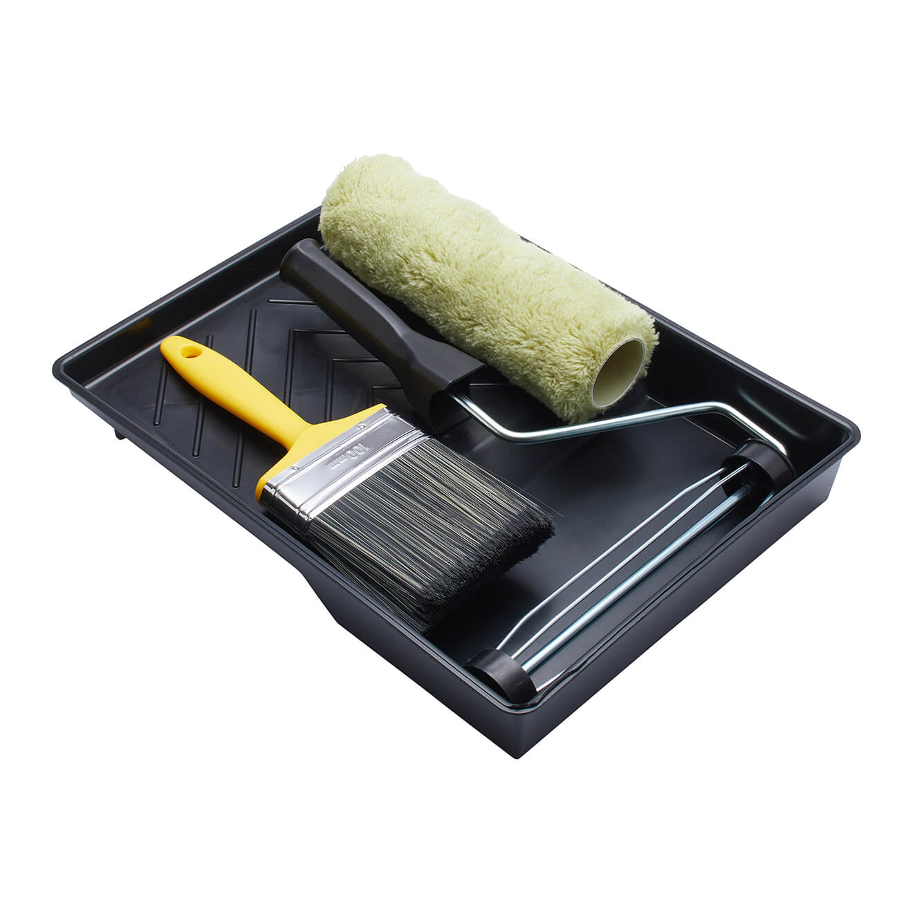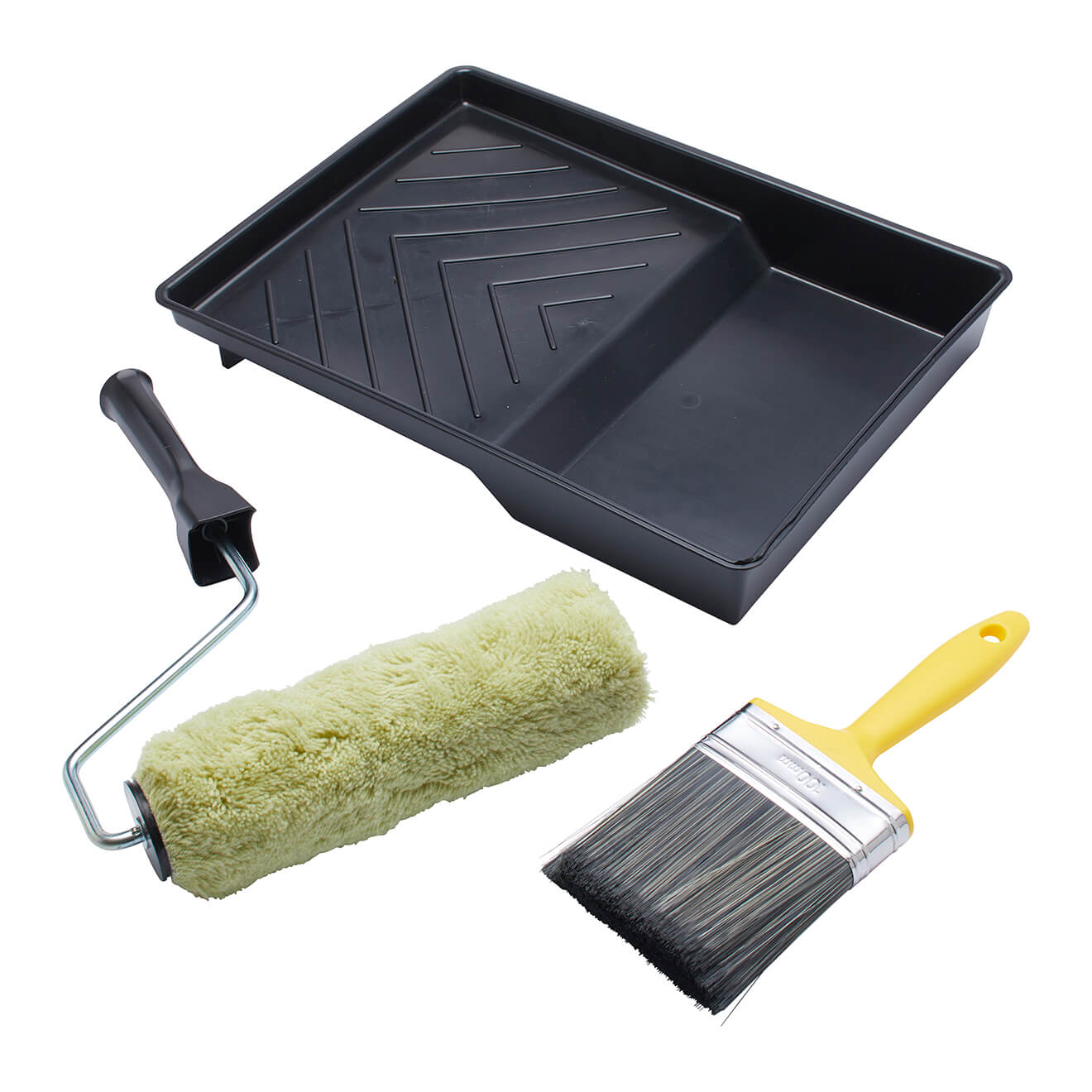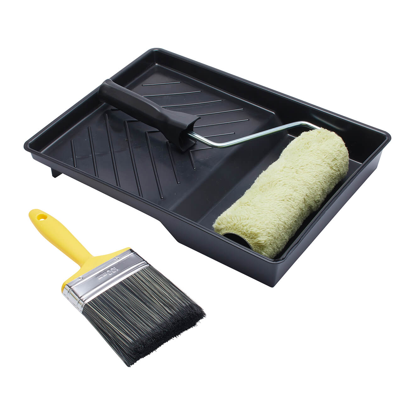 Comprising roller, frame, tray and 4" masonry brush, this 4 piece heavy duty set is ideal for both water- and solvent-based smooth and textured masonry paints. With a long pile that is suitable for rough and very rough surfaces such as brick, breeze block, cement and render, where it is effective at getting into the surface texture, the high durability woven roller picks up plenty of paint, giving even application and excellent coverage. The durable, hardwearing cage roller frame has a push fit handle for extension poles and the paint tray is made from 100% recycled plastic. The brush features a blend of pure grey bristle and synthetic filaments that combine optimum paint loading with the durability that is essential for the heavy duty demands of rough surfaces. The long bristles hold plenty of paint and enable it to get right into surface textures and effectively apply paint without splaying at the tip.